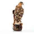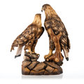 wooden figure represents an eagle group. The larger eagle sits on a branch,