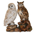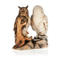an awesome woodcarved figure consisting of the owl on perch and the snowy owl.