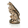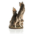 sitting and howling, the second one is standing beside him. The wood carved